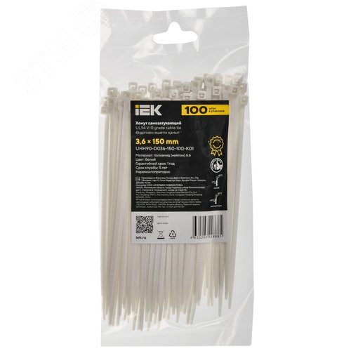Хомут P6.6 самозатухающий белый 3.6х150мм 100шт/упак IEK