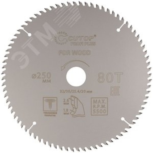 Диск пильный по дереву с тефлоновым покрытием 80Т, Profi plus, 250x1,8/2,6x32/30/25,4/20 мм