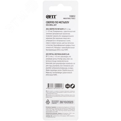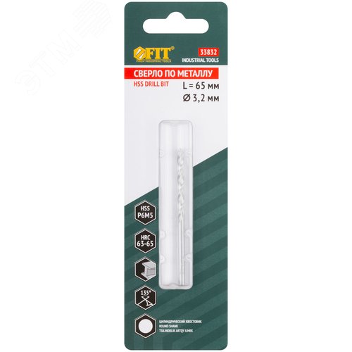 Сверло по металлу HSS полированное, центровочный наконечник, Р6М5, блистер 3,2х65 мм