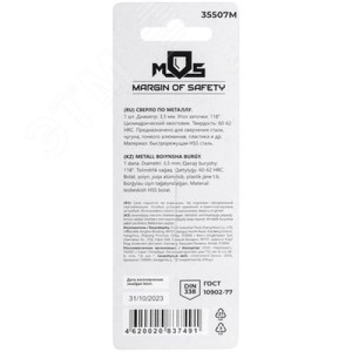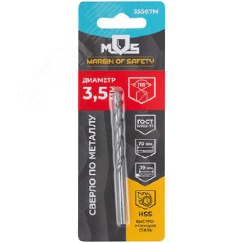 Сверло по металлу HSS в блистере, угол заточки 118град, 3,5X70 мм