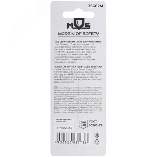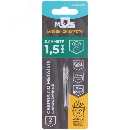 Сверла по металлу HSS шлифованные в блистере, угол заточки 135град, 1,5X43 мм