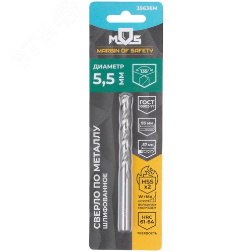 Сверло по металлу HSS шлифованное в блистере, угол заточки 135град, 5,5X93 мм
