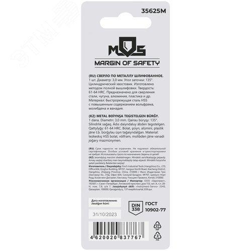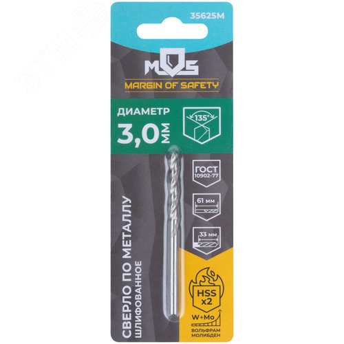 Сверло по металлу HSS шлифованное в блистере, угол заточки 135град, 3,0X61 мм