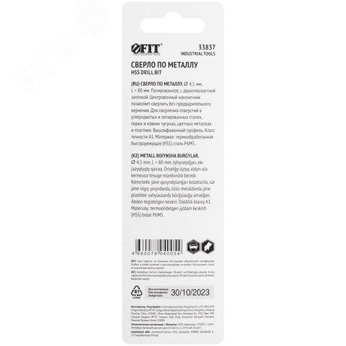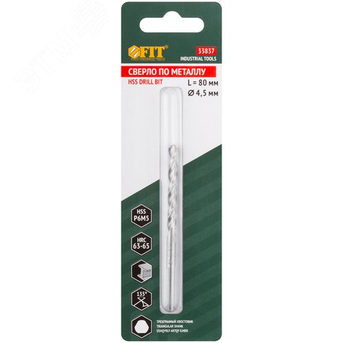 Сверло по металлу HSS полированное, центровочный наконечник, Р6М5, блистер 4,5х80 мм