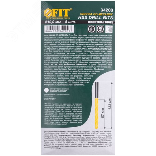 Сверла HSS по металлу, титановое покрытие 10,0 мм (5 шт)