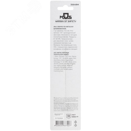 Сверло по металлу HSS шлифованное в блистере, угол заточки 135град, 10,2X133 мм