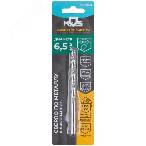 Сверло по металлу HSS шлифованное в блистере, угол заточки 135град, 6,5X101 мм