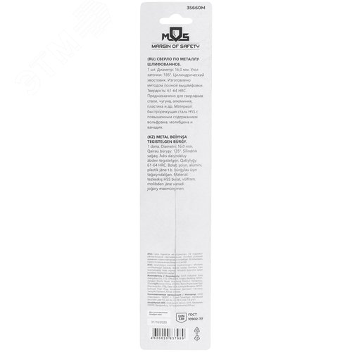 Сверло по металлу HSS шлифованное в блистере, угол заточки 135град, 16,0X178 мм