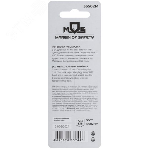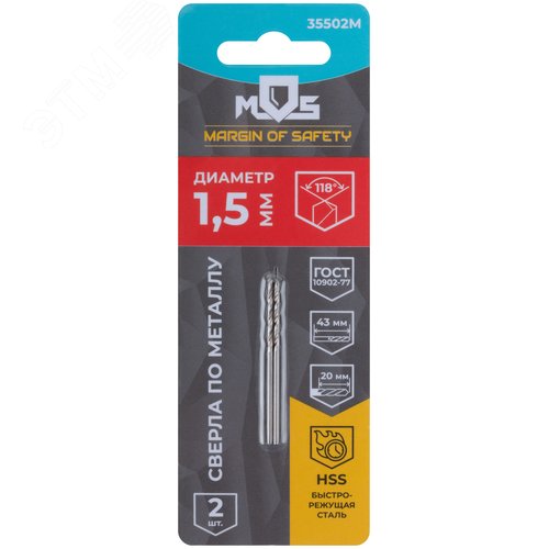Сверла по металлу HSS в блистере, угол заточки 118°, 1,5 x 43 мм
