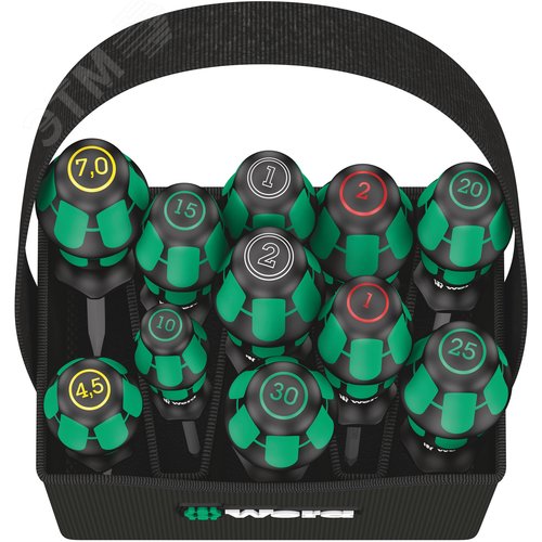 Дополнительная информация 11 отвёрток Kraftform серия 300, для винтов с прямым шлицем, Phillips, Pozidriv, TORX. Идентификаторы инструментов ''Take it easy'' цветовая кодировка профиля наконечника и маркировка размера на ручке отвёртки. 1 прочный, сохраняющий форму подсумок, с ручкой для переноски, для хранения и переноски инструментов. С зоной на липучках для прикрепления к системе Wera 2go. Имеется 1 разделитель на липучках для получения до 5 карманов. Отличается высокой устойчивостью к порезам и проколам. 1 x 105.0x165.0, 1 x PH 1x80, 1 x PH 2x100, 1 x PZ 1x80, 1 x PZ 2x100, 1 x TX 10x80, 1 x TX 15x80, 1 x TX 20x100, 1 x TX 25x100, 1 x TX 30x115, 1 x 0.8x4.5x90, 1 x 1.2x7.0x125