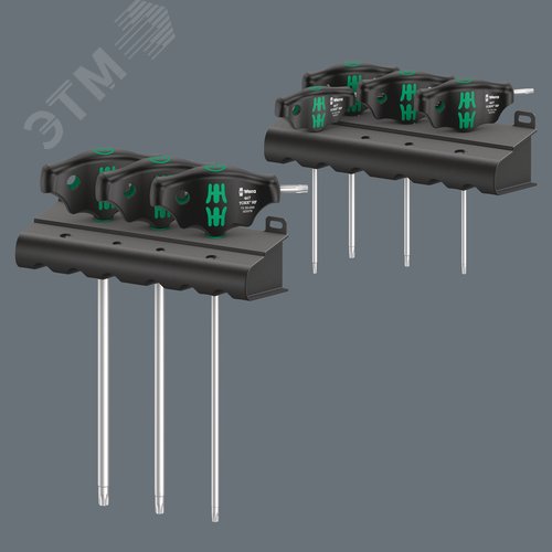 Набор отвёрток с Т-образной рукояткой с двумя подставками 467/7 TORX HF Set 1 с функцией фиксации крепежа TX 10 - 45 7 предметов комплектация: 7x 467 TORX HF Отвёртка с поперечной ручкой с фиксирующей функцией: TX 10x100 TX 15x100 TX 20x100 TX 25x100 TX 3
