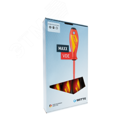 Дополнительная информация Преимущества отвертки WITTE MAXX VDE - плавная, продольная форма рукоятки для отличной передачи давления руки, проверенная временем трехгранная форма рукоятки соответствует идеальному углу вращения руки (120 градусов), мягкий материал на ребрах рукоятки удобный для захвата, зона быстрого вращения из мягкого материала делает работу приятной и уверенной, рабочий стержень с защитной изоляцией, изоляция в соответствии с стандартом DIN ISO EN 60900 С, черный рабочий наконечник для максимальной точности.