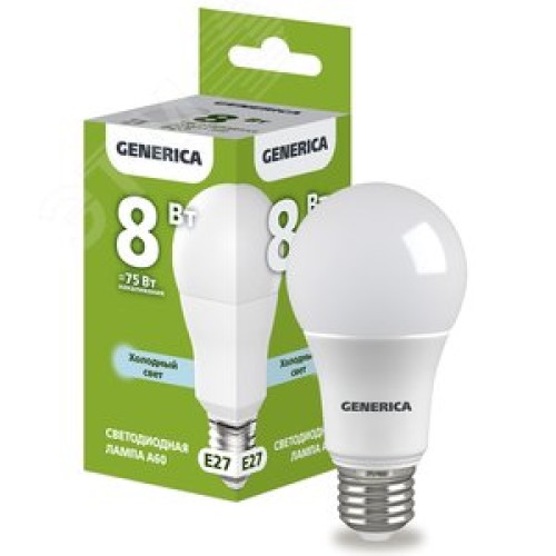 Лампа светодиодная A60 груша 8Вт 230В 6500К E27 GENERICA