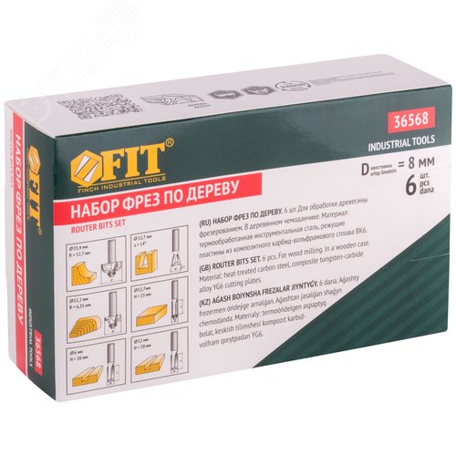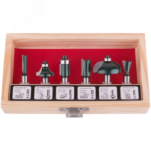 Фрезы по дереву кромочные, набор 6 шт, деревянный бокс, хвостовик 8 мм