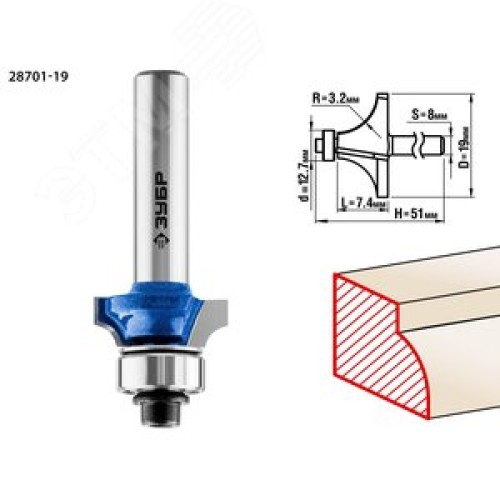 Кромочная калевочная фреза Профессионал №1, 19x7.4 мм, радиус 3.2 мм
