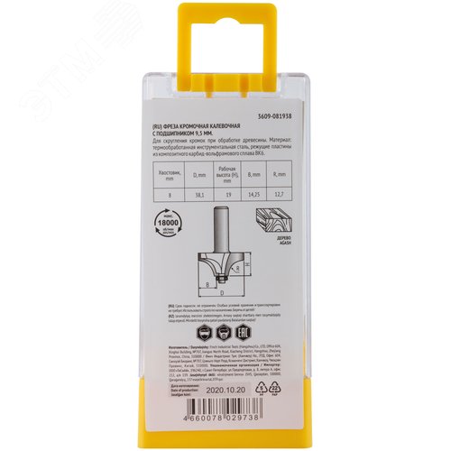 Фреза кромочная калевочная с подшипником DxHxL=38,1х19х57,7 мм