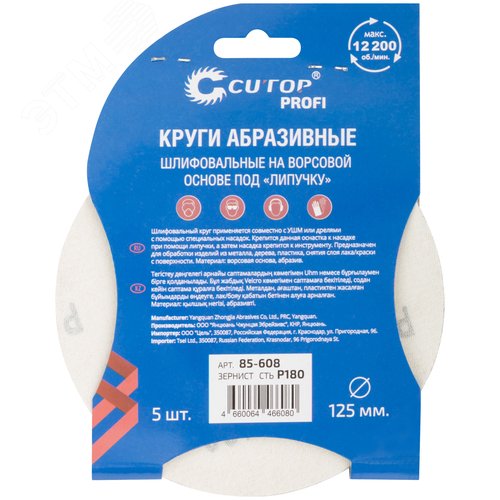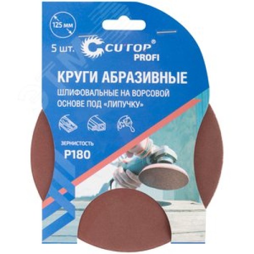 Круги абразивные шлифовальные на ворсовой основе под ''липучку'' (Р180, 125 мм, 5шт), Cutop Profi
