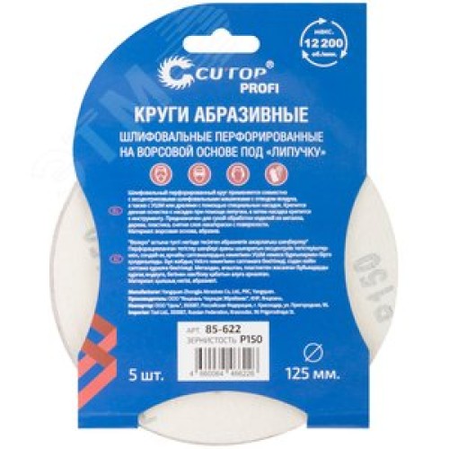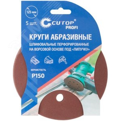 Круги абразивные шлифовальные перфорированные на ворсовой основе под ''липучку'' (Р150, 125 мм, 5шт), Profi