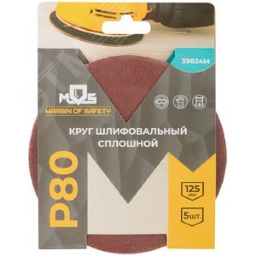 Круги шлифовальные сплошные (липучка), алюминий-оксидные, 125 мм, 5 шт Р 80 гибкая -14А