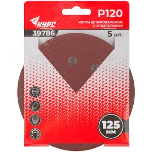 Круги шлифовальные с отверстиями (липучка), алюминий-оксидные, 125 мм, 5 шт Р 120 гибкая -14А