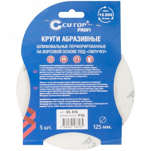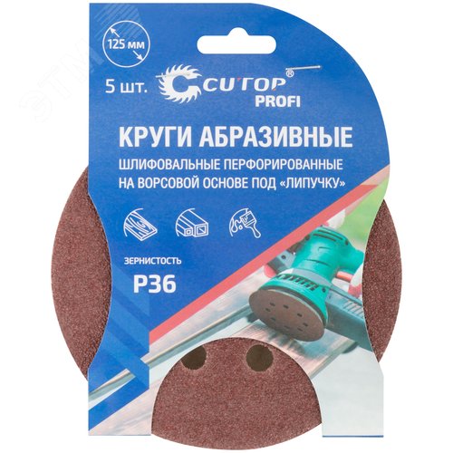 Круги абразивные шлифовальные перфорированные на ворсовой основе под ''липучку'' (Р36, 125 мм, 5шт), Profi