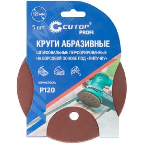 Круги абразивные шлифовальные перфорированные на ворсовой основе под ''липучку'' (Р120, 125 мм, 5шт), Profi