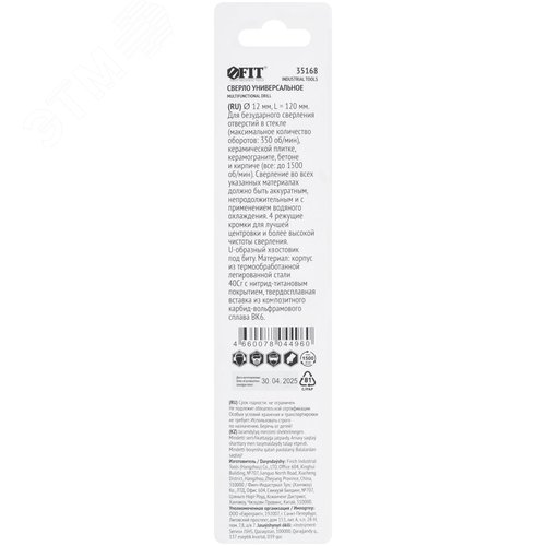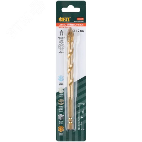 Сверло универсальное, 4 режущие кромки, титановое покрытие, шестигранный U-хвостовик под биту, 12х120 мм