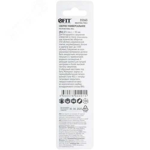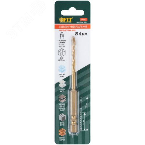 Сверло универсальное, 4 режущие кромки, титановое покрытие, шестигранный U-хвостовик под биту, 4х90 мм