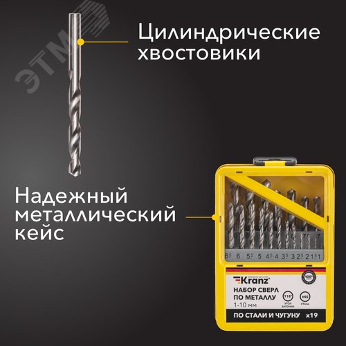 Набор сверл по металлу, 1-10 мм (через 0,5 мм), HSS, цилиндрический хвостовик, металлический кейс, 19 шт.