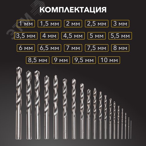 Дополнительная информация диаметр сверл в наборе - 1, 1,5, 2, 2,5, 3, 3,5, 4, 4,5, 5, 5,5, 6, 6,5, 7, 7,5, 8, 8,5, 9, 9,5, 10 мм