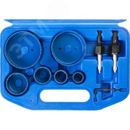 Набор коронок-чашек ''Профессионал'' c карбид-вольфрамовым нанесением, 6 коронок-чашек d 22, 28, 35, 44, 68, 73 мм, 2 державки со сверлами, ключ
