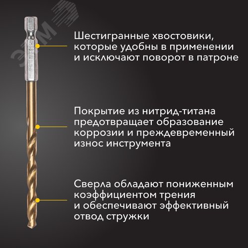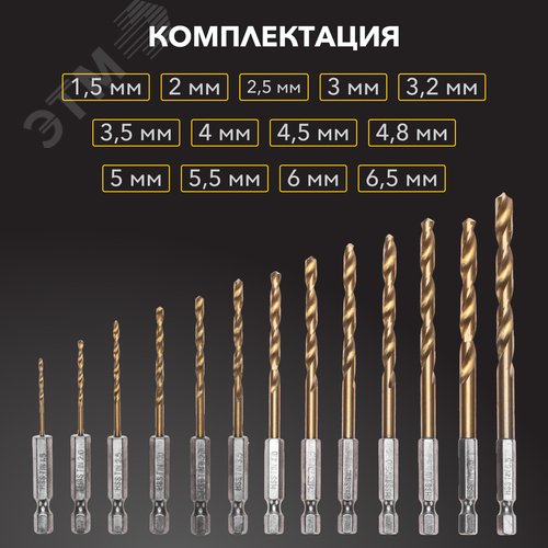 Набор сверл по металлу, 1,5-6,5 мм (через 0,5 мм, 3,2 мм, 4,8 мм), HSS, ТИТАН, шестигранный хвостовик, 13 шт.