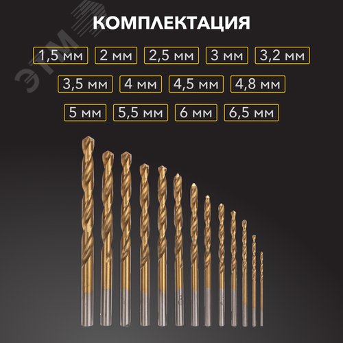 Дополнительная информация диаметр сверл в наборе - 1,5, 2, 2,5, 3, 3,2, 3,5, 4, 4,5, 4,8, 5, 5,5, 6 мм