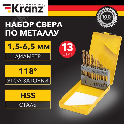 Набор сверл по металлу, 1,5-6,5 мм (через 0,5 мм, 3,2 мм, 4,8 мм), НSS, ТИТАН, цилиндрический хвостовик, металлический кейс, 13 шт.