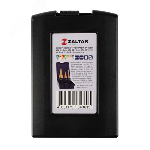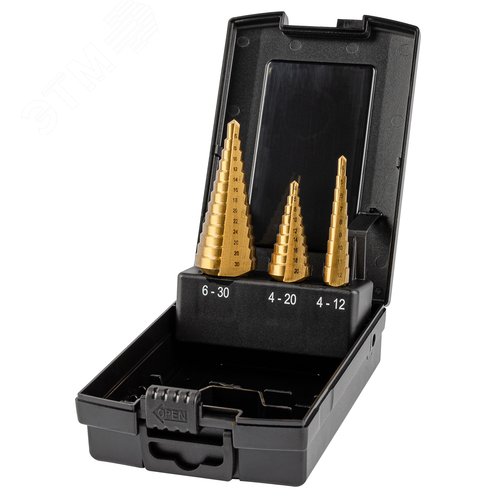 Набор сверл ступенчатых, 3 предмета, HSS TiN, Gr,1,2,3, 4-12, 4-20, 6-30 мм, прямая канавка, трехплоскостной хвостовик