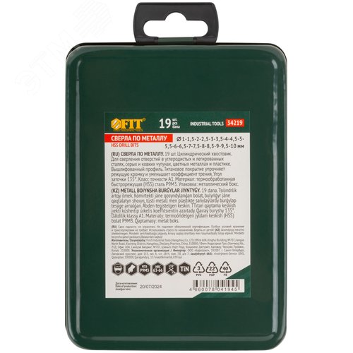 Набор сверл HSS по металлу, титановое покрытие, 19 шт. (1-10 мм), металлический бокс