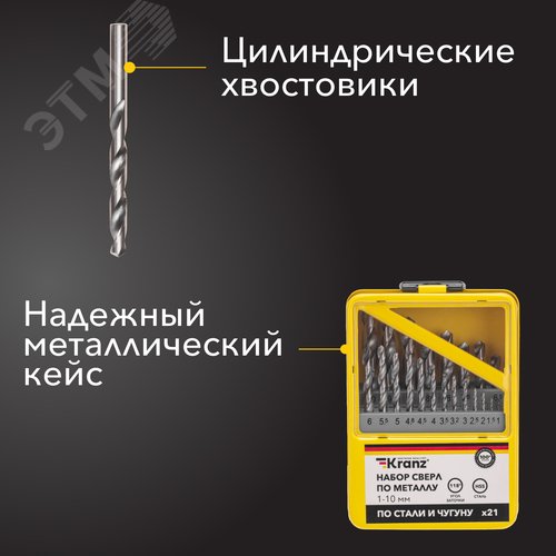 Набор сверл по металлу, 1-10 мм (через 0,5 мм, 3,2 мм, 4,8 мм), HSS, цилиндрический хвостовик, металлический кейс, 21 шт.