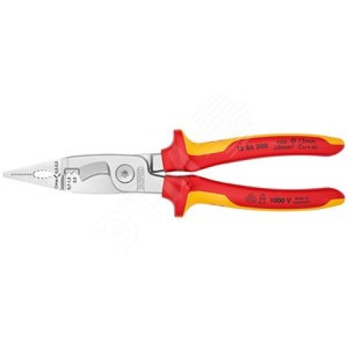 Клещи электромонтажные VDE 1000V 6-в-1 захват плоского и круглого материала гибка удаление заусенцев снятие изоляции 075 - 15 + 25 мм обжимка контактных гильз 05 - 25 мм кабелерез 15 мм (5x25 мм) L-200 мм диэлектрические чёрные 2-компонентные рукоятки