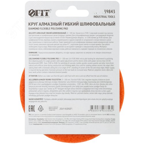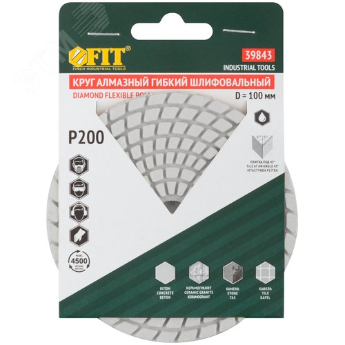 Круг алмазный гибкий шлифовальный АГШК (липучка), влажное шлифование, 100 мм, Р 200