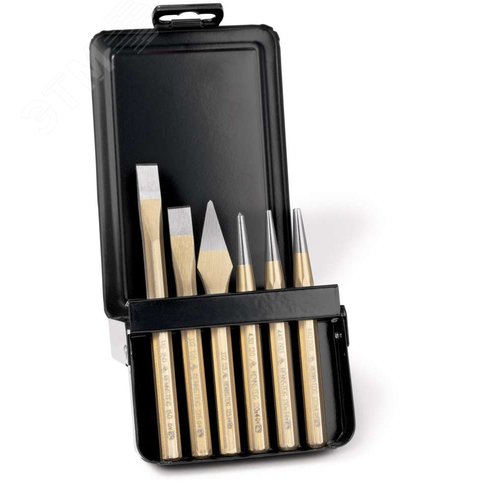 Дополнительная информация Набор инструментов металлу, 6 предметов - зубила плоские 125 / 150 мм, крейцмейсель 125 мм, кернер диаметром 4 мм, пробойники диаметром 3 / 4 мм, металлический кейс.