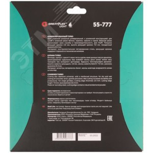 Диск отрезной алмазный комбинированный турбо GreatFlex Light, 230X2.6X7.0X22.2 мм