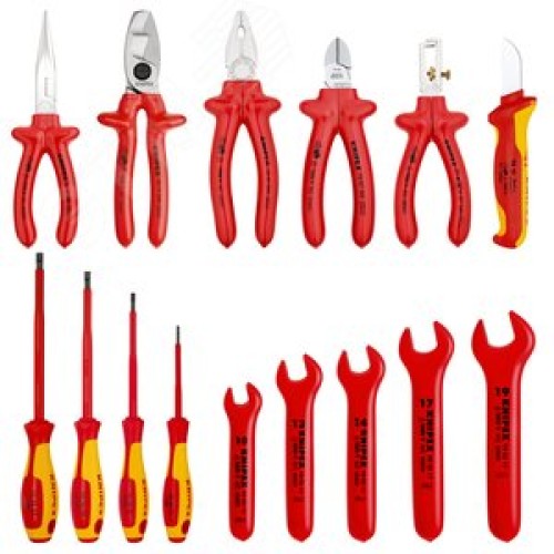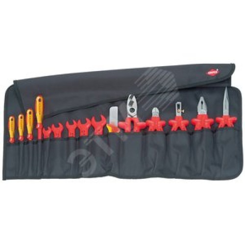 Набор инструмента VDE 1000V в мягком планшете 15 предметов комплектация: плоскогубцы 0307200 стриппер 1107160 круглогубцы 2617200 бокорезы 7007160 кабелерез 9517200 ключи рожковые 9800xx 10/13/14/17/19 мм отвёртки 9820xx SL 25/4/55/65 нож для кабеля 9852