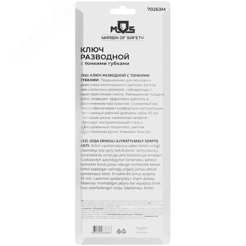 Ключ разводной с тонкими губками, пластиковая накладка на ручку, 200 мм, 45 мм