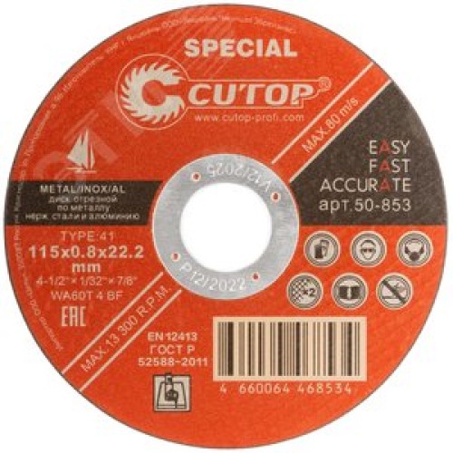 Диск профессиональный специальный отрезной по металлу, нержавеющей стали и алюминию Cutop Special, Т41-115x0,8x22,2 мм