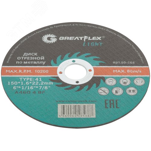 Диск отрезной по металлу T41-150x1.6x22.2 мм, LIGHT