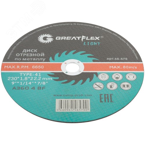 Диск отрезной по металлу T41-230x1.8x22.2 мм, LIGHT