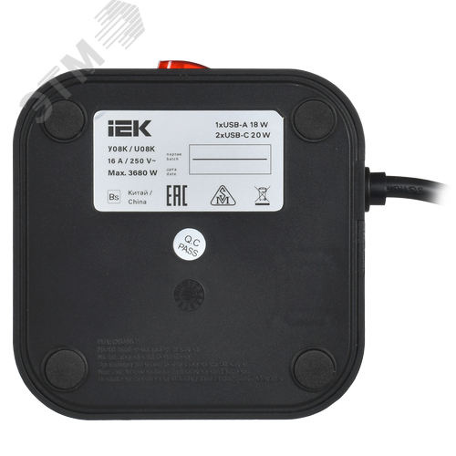 DOMINIC Удлинитель У08K 8 мест 2P+PE 1,5м 3х1,0мм2 16А/250В USB A+C 20Вт черный IEK