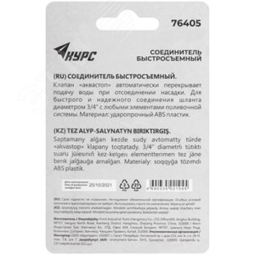 Соединитель пластиковый 3/4'', автостоп