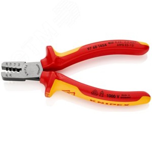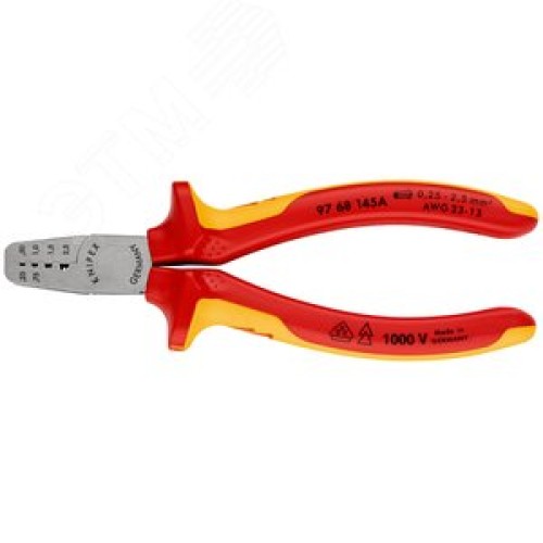 Пресс-клещи VDE 1000V для обжима контактных гильз 4 гнезда 025-25мм (AWG 23-13) L=145мм двухкомпонентные рукоятки диэлектрические