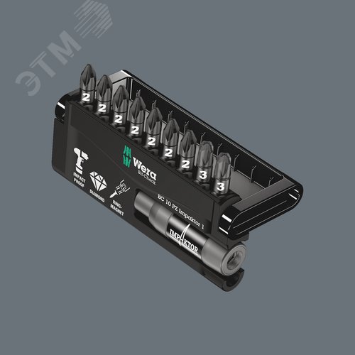 Дополнительная информация 1 держатель Impaktor с пружинным стопорным кольцом и кольцевым магнитом в креплении для надежной фиксации насадок в держателе, 9 битов Impaktor - 1 x 1/4''x75, 7 x PZ 2x25, 2 x PZ 3x25. В наборах Bit-Check с идентификаторами ''Take it easy'' биты снабжены метками, которые благодаря своему цвету и указанию размера делают отбор нужного бита быстрым и легким.